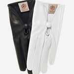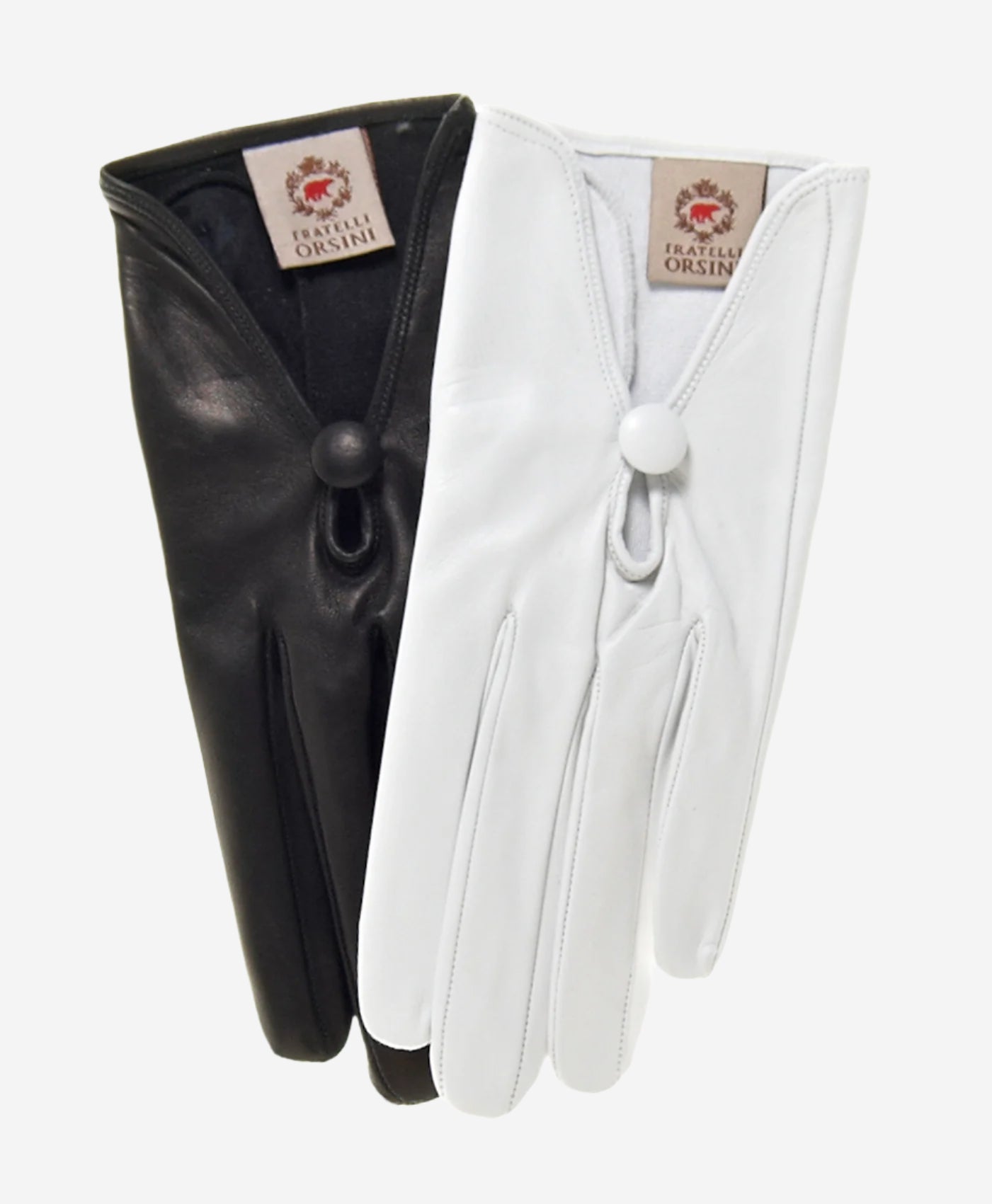 Today's short profile, swoop-styling is given a new twist with the simple button closure on the back of the hand that becomes the focus of the look.  Made in Italy by our artisans at Fratelli Orsini, these gloves are made of 100% Italian materials, including Italian silk and Italian lambskin.  Available in black and ivory.