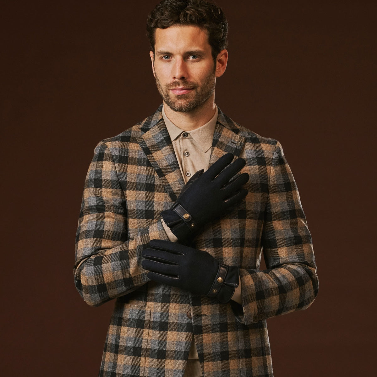 Premium materials: Smooth Italian lambskin leather on the palm ensures durability, comfort, and a secure grip, while the back is finished in soft, textured wool tweed. A leather strap with snap button adds a refined, tailored touch.