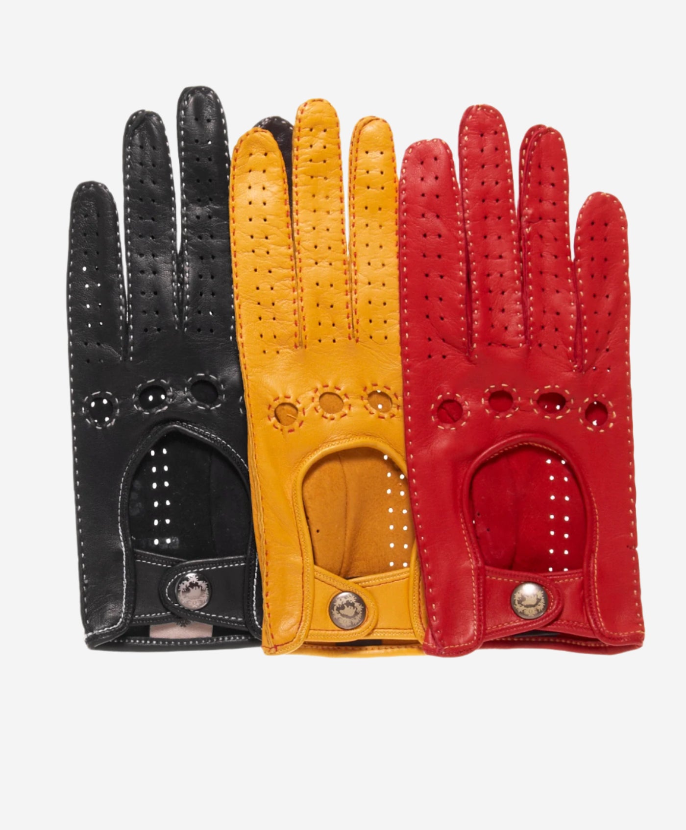 Attention-getting colors and unique details highlight these playful and modern Italian leather driving gloves for women. While the open back style and snap closure are classic elements, contrast stitching throughout the glove adds unexpected color that highlights the unique craftsmanship of these gloves. A combination of hand sewing and intricate machine stitching along with the finest Italian lambskin make apparent the high quality from top Italian glovemakers Fratelli Orsini.