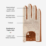 Style: Inspired by classic racing, the Valeria crochet driving gloves are a stylish and practical choice for summer. Featuring a beautiful combination of cognac lambskin leather and hand-sewn beige crochet from organic cotton, these gloves are designed to provide both elegance and comfort.