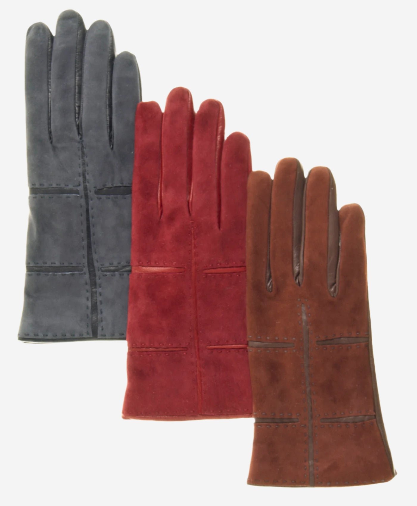 A unique design of decorative leather inserts handsewn details on the back dresses up this great pair of casual and warm suede and lambskin gloves. Women are sure to appreciate the incredible value of these gloves, which are made in Italy with the same superior care that goes into the best Italian dress gloves by Fratelli Orsini. With a lambskin palm for comfortable grip and luxury lining of the finest Italian cashmere, these are excellent gloves for dress and casual wear.