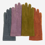 These handsewn cashmere lined Carpincho dress gloves are exotic while also being very elegant. Made of carpincho, the hide of the Capybara native to South America, it is related to Peccary but much rarer. These wonderful buttery soft gloves are offered in the four distinct colors of blue, coffee, lilac and moss that display and highlight the natural Carpincho grain. The palm side of the gloves is made of contrasting soft lambskin leather. Lined in 100% Italian cashmere, you won't find a more interesting pair of dress gloves!