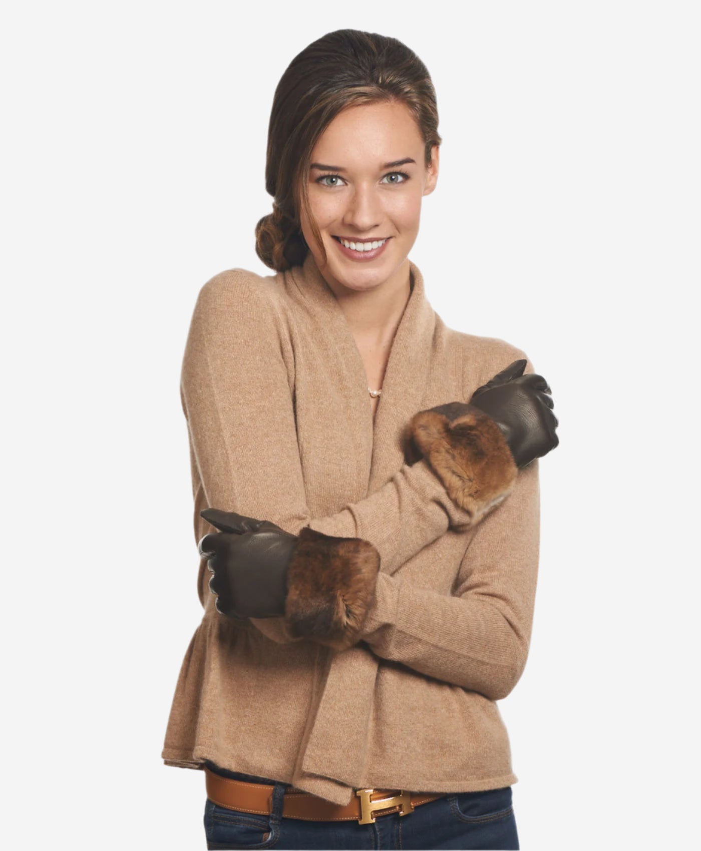 CR4450 (brown) - Women's Italian Orylag Rabbit Fur Cuff Cashmere Lined Winter Leather Gloves - Leather Gloves Online - Luxury Leather Gloves - 1