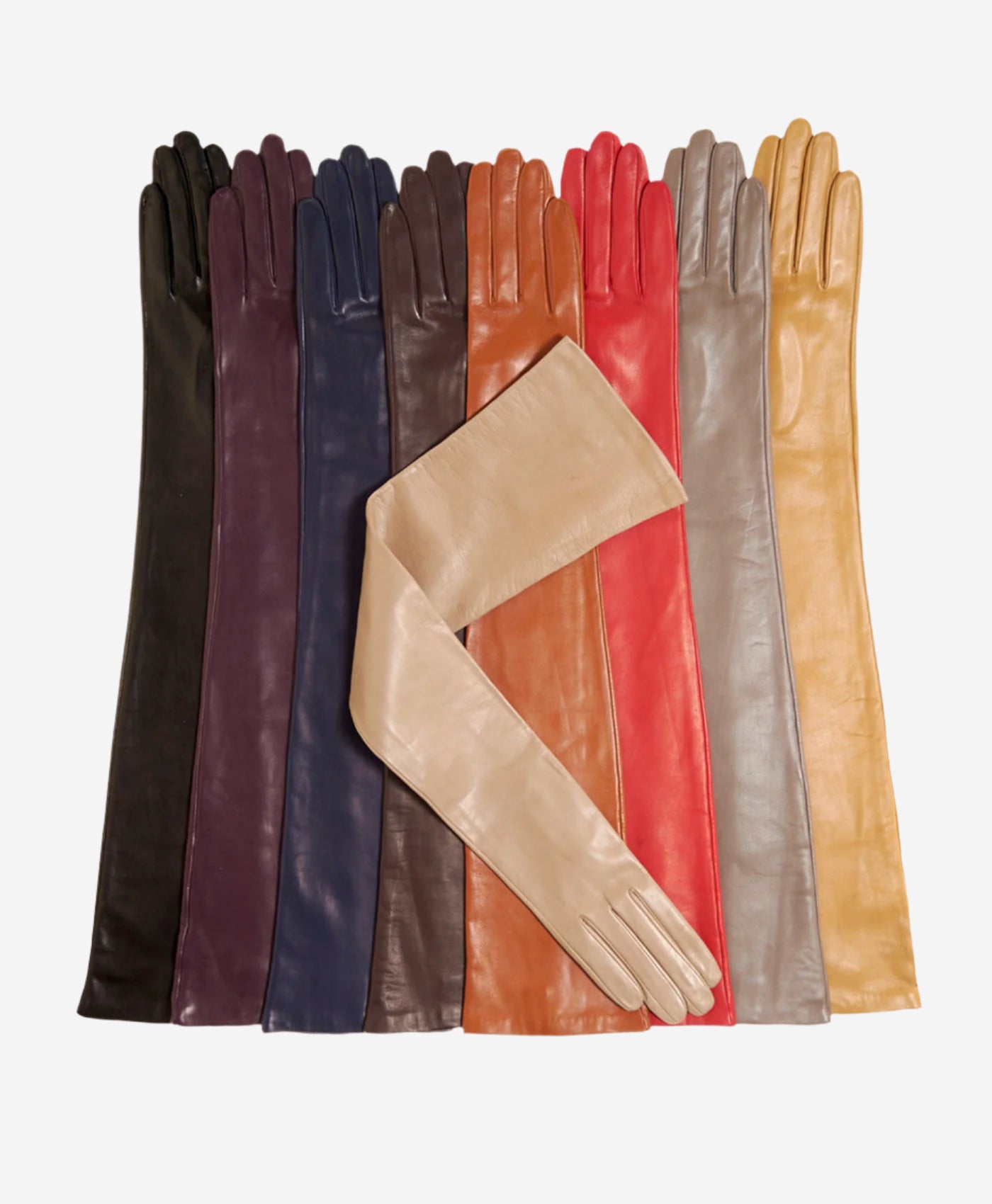 These are the best women's leather opera length gloves we carry. Styled in the traditional 16-button opera length, they extend beyond the elbow and nearly reach the shoulder. Their impeccable quality is visible in every stitch. They are crafted from the best Italian lambskin leather and lined with the finest Italian silk, which wraps your full arm in luxury for the entire evening. These long leather gloves are very similar to our long wedding and opera gloves except they come in many of the new trendiest colors and do not have the three buttons at the palm side wrist. We import these long leather gloves from Italy, where designers at Fratelli Orsini craft them exclusively for us.