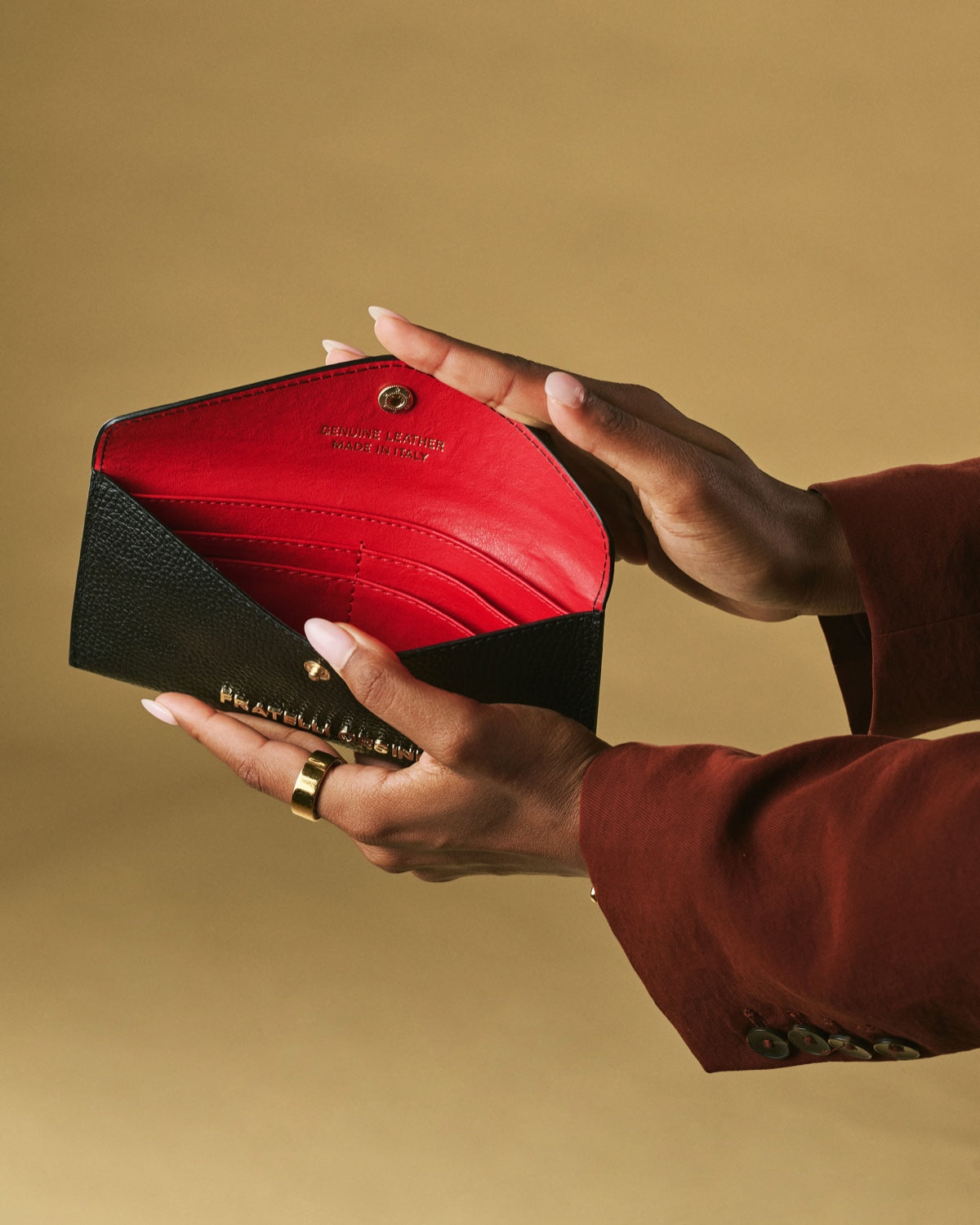 The Carmina wallet is a compact and refined accessory designed for daily use. Handmade in Italy by skilled artisans, it is crafted from full-grain calf leather with a softly textured grain that gives it a timeless and versatile look. The slim silhouette fits comfortably in the hand or a bag, while the interior layout provides structure and clarity for cards and bills.
