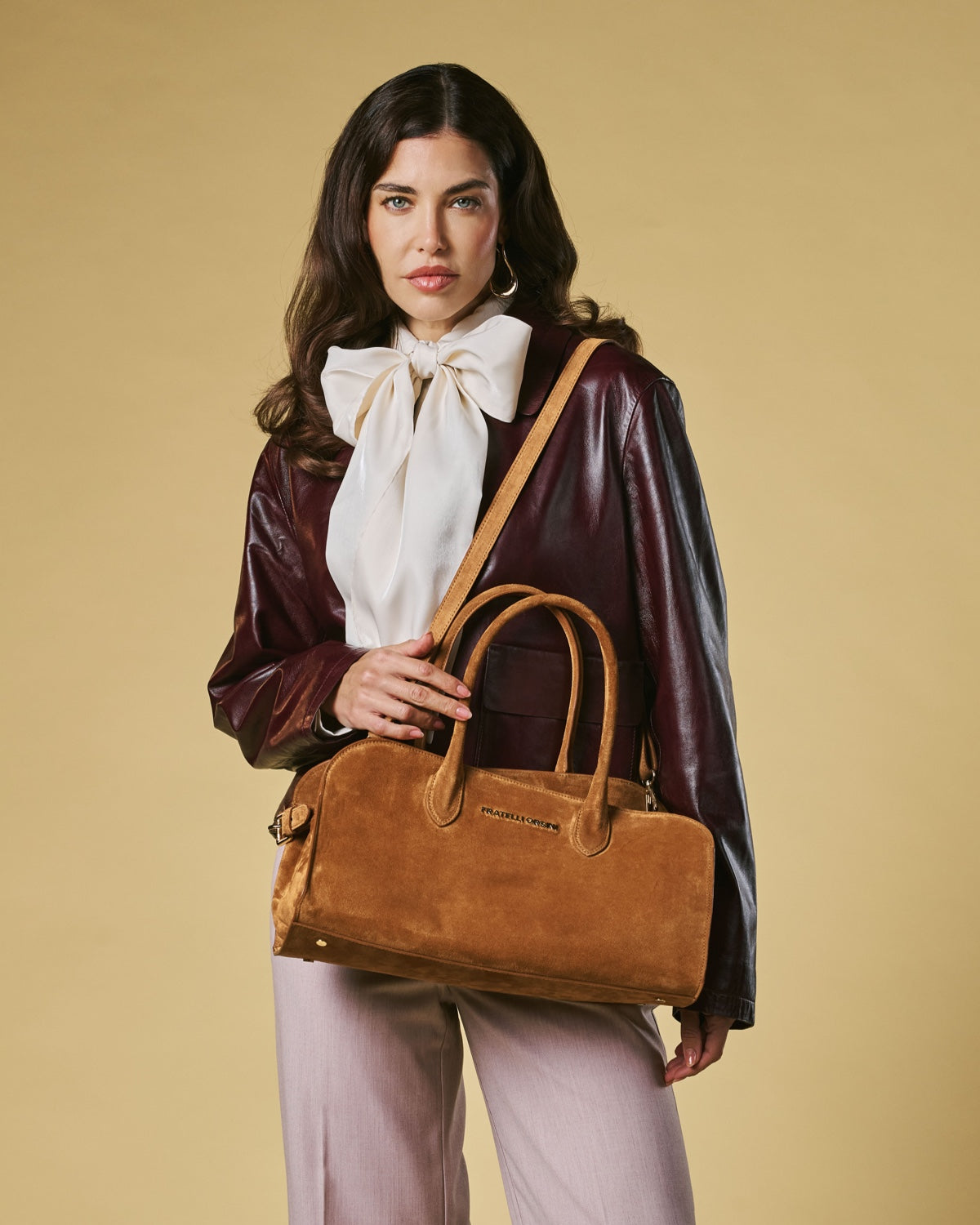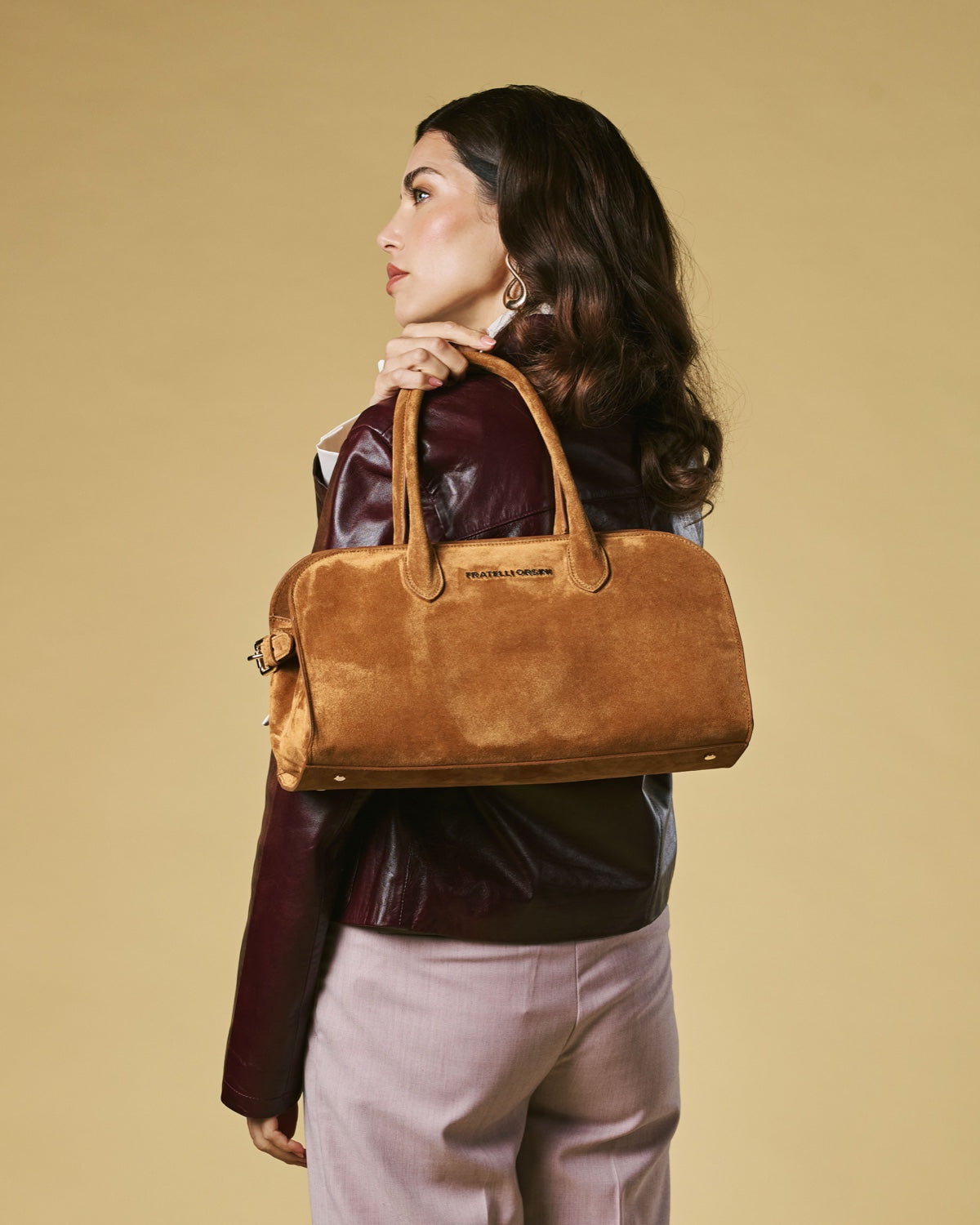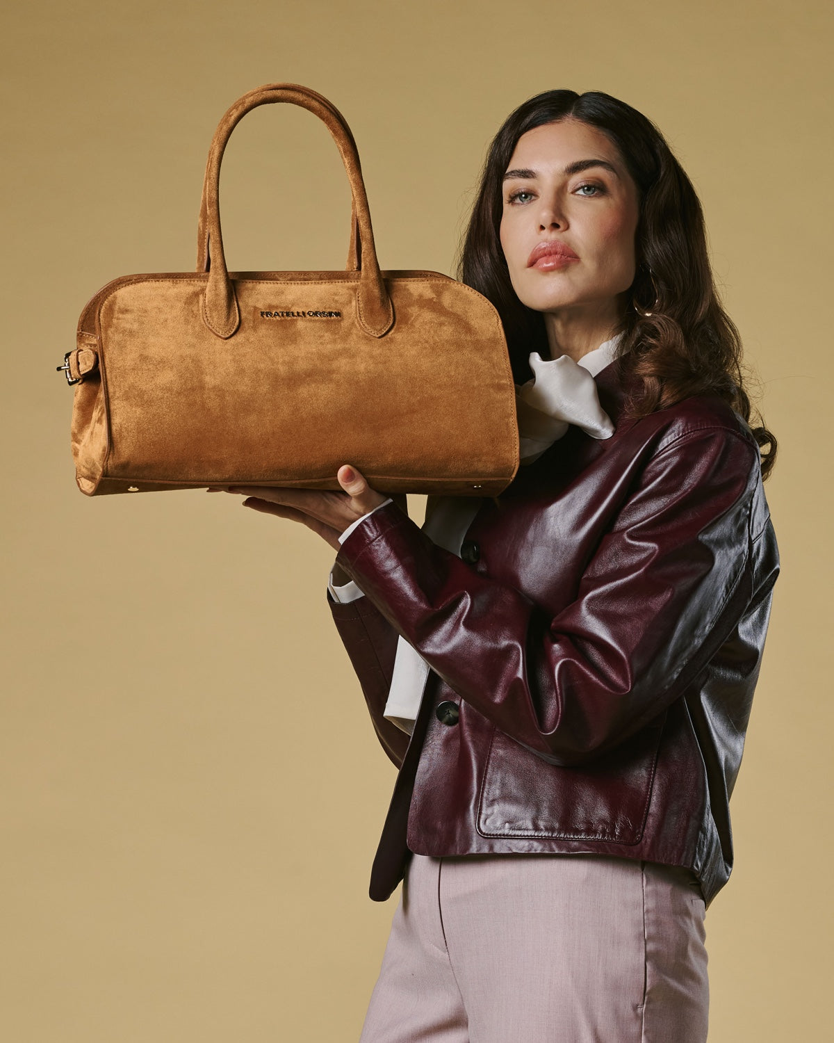 The Chiara handbag from Fratelli Orsini offers a softer expression of Italian luxury through its refined suede finish and gently structured silhouette. Handmade in Italy by skilled artisans, it is crafted from premium calf suede that creates a warm, tactile surface with a naturally elegant drape. The rounded top handles and clean proportions give the bag a graceful, understated presence that pairs well with both classic and contemporary styling.