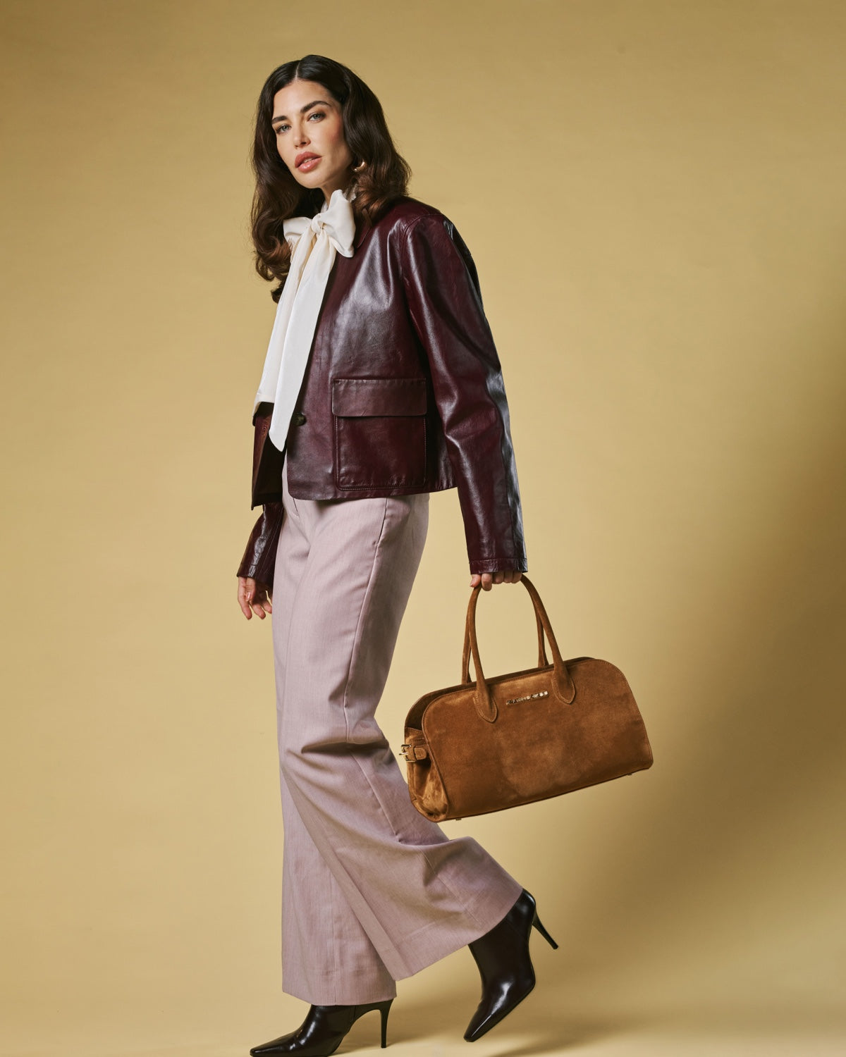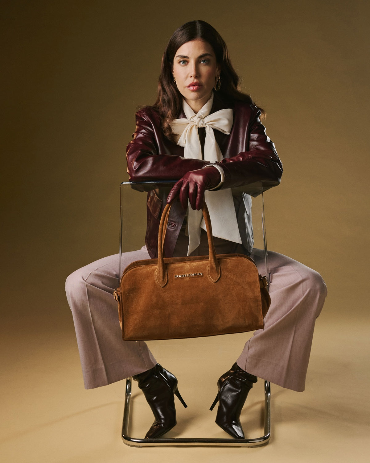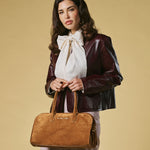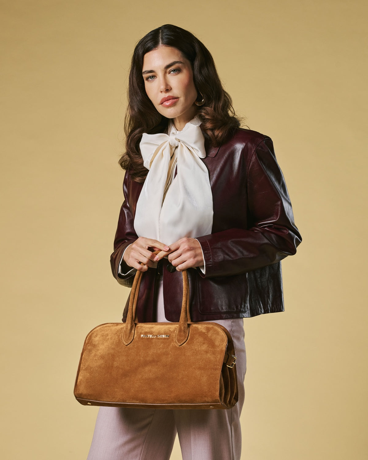 The Chiara handbag from Fratelli Orsini offers a softer expression of Italian luxury through its refined suede finish and gently structured silhouette. Handmade in Italy by skilled artisans, it is crafted from premium calf suede that creates a warm, tactile surface with a naturally elegant drape. The rounded top handles and clean proportions give the bag a graceful, understated presence that pairs well with both classic and contemporary styling.