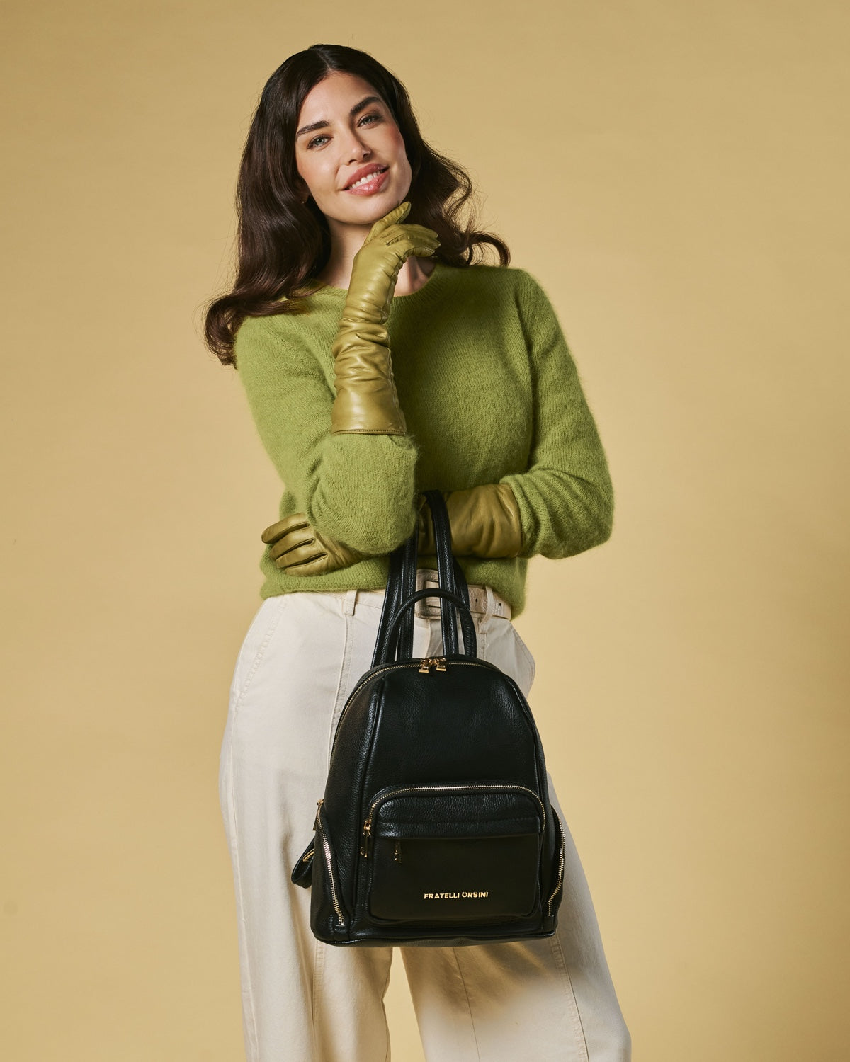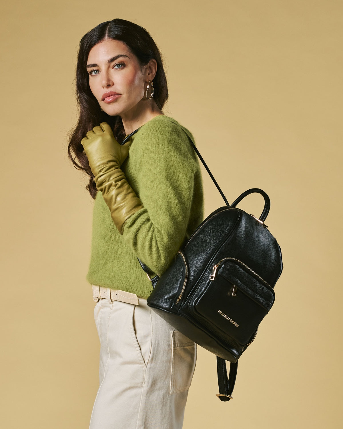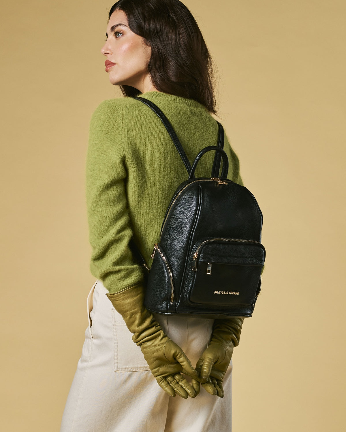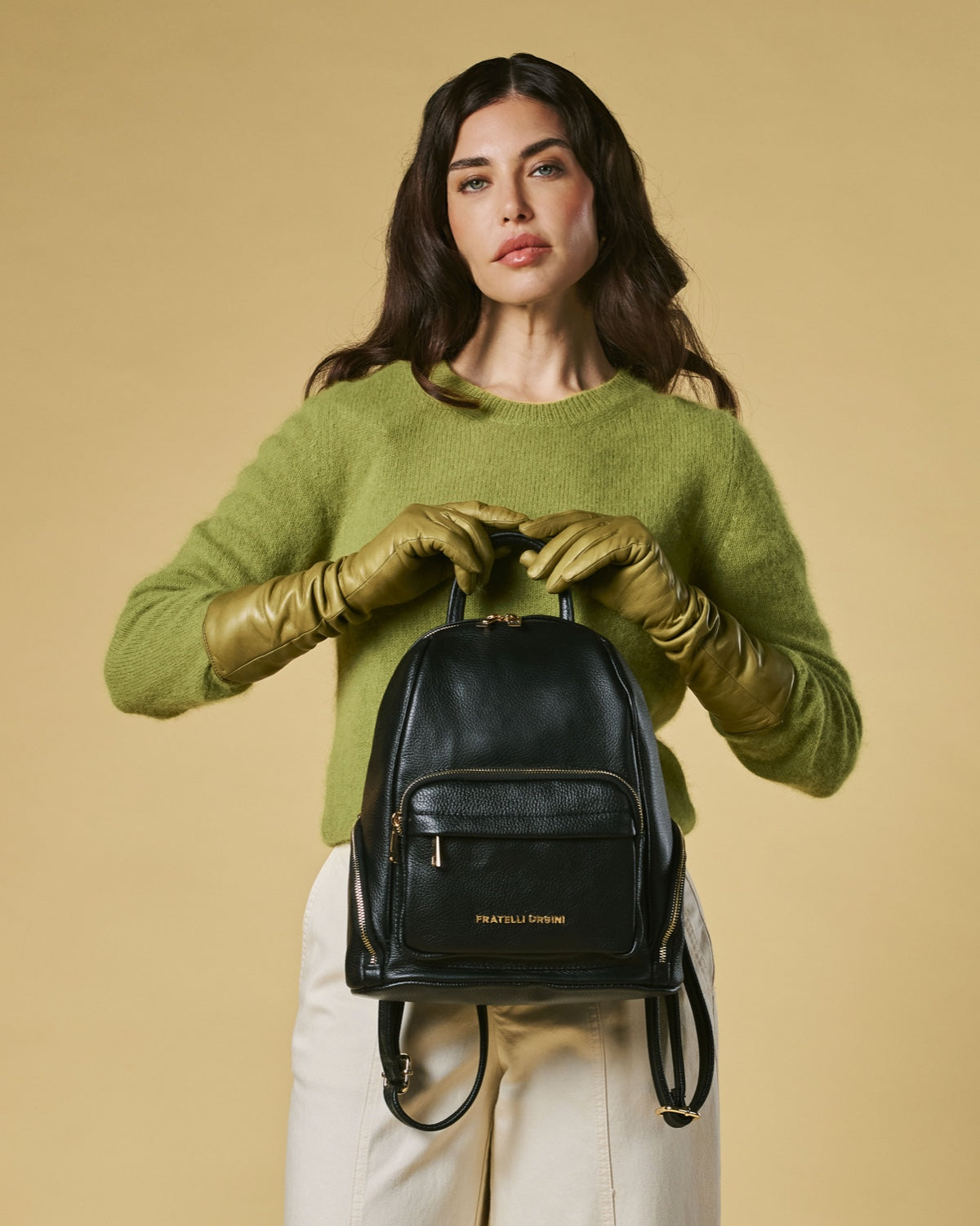 The Martina backpack from Fratelli Orsini is a modern interpretation of Italian craftsmanship shaped into a practical everyday design. Handmade in Italy by skilled artisans, it is crafted from full-grain calf leather with a natural grain texture that feels supple yet durable. Its structured form is complemented by gold-toned zippers and refined detailing, giving it a polished look suitable for both city wear and travel.