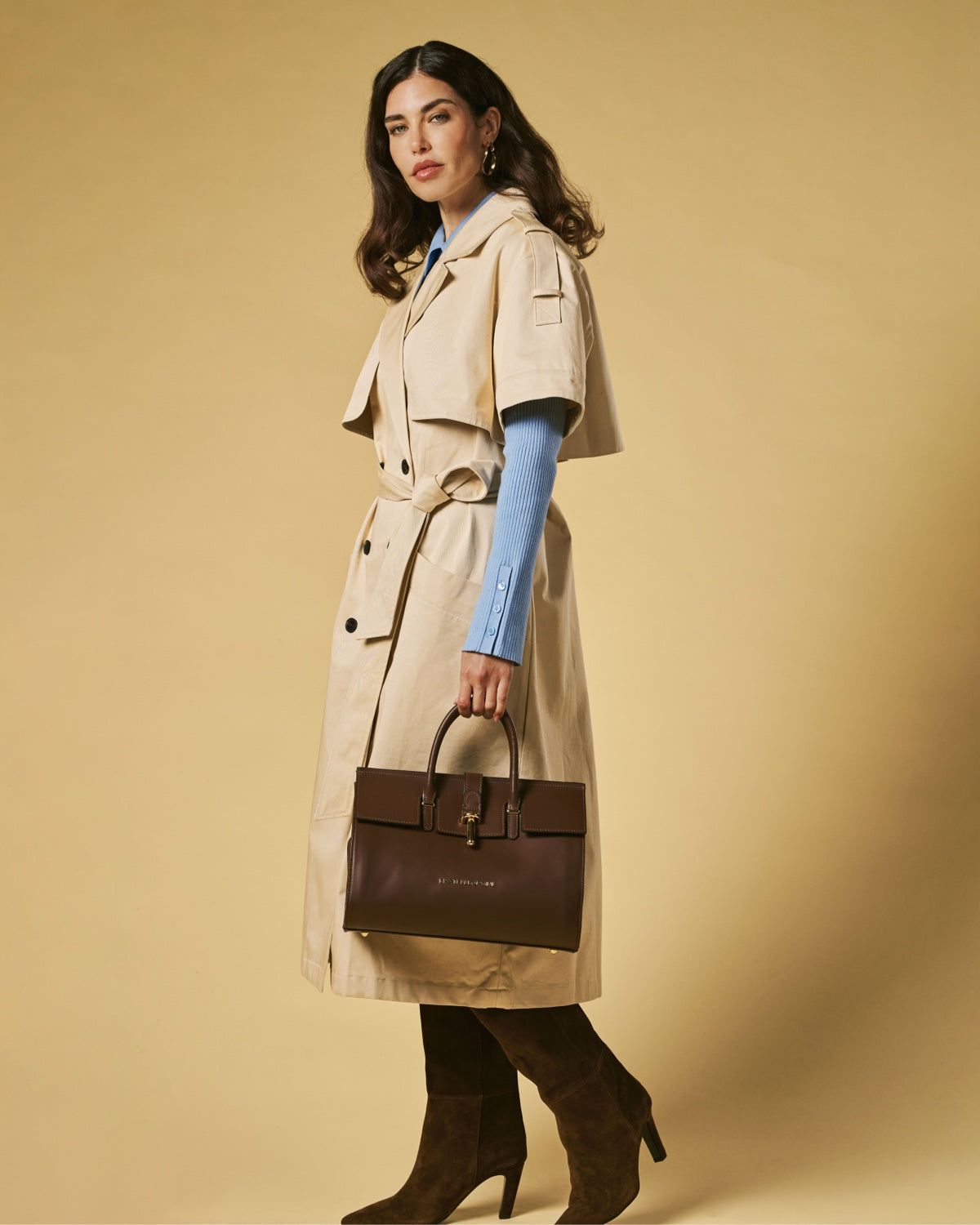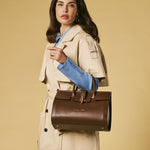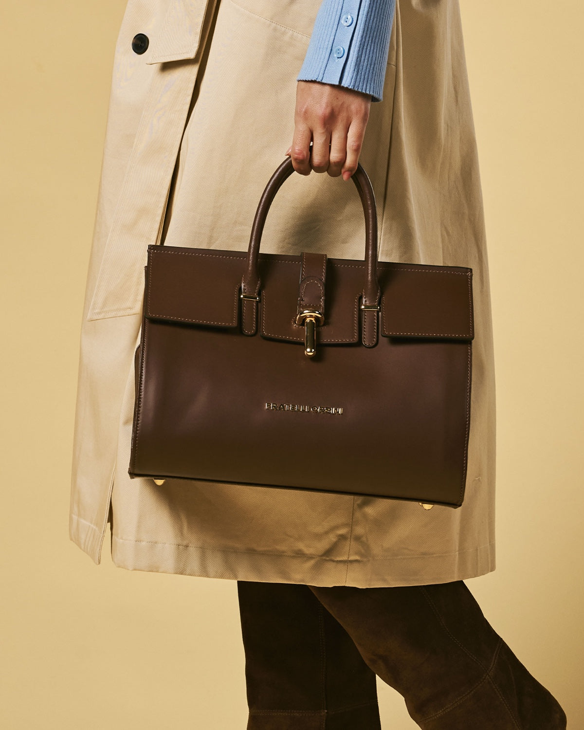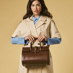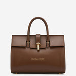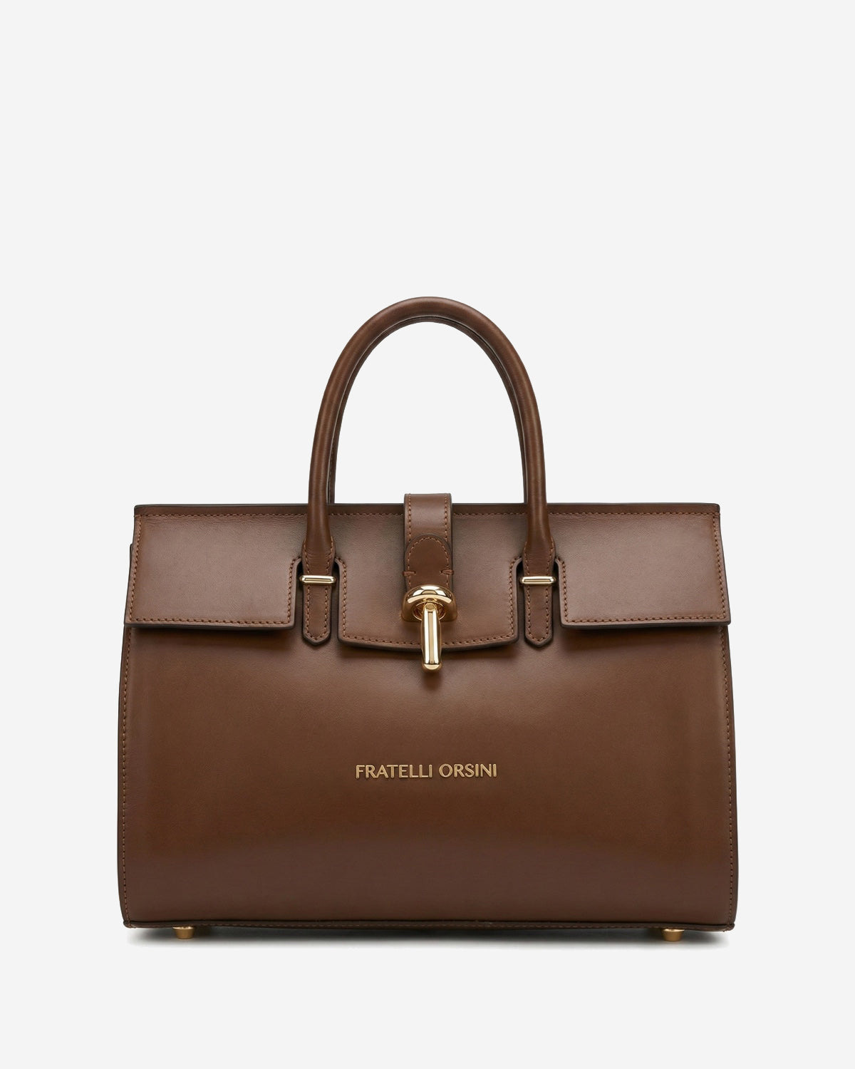 The Oriana handbag from Fratelli Orsini is defined by its structured elegance and refined top-handle silhouette. Handmade in Italy by skilled artisans, it is crafted from full-grain calf leather with a smooth finish that gives the design a polished look. The gold-toned clasp detail adds a subtle focal point while keeping the overall character understated and timeless.