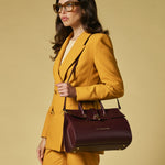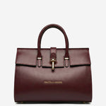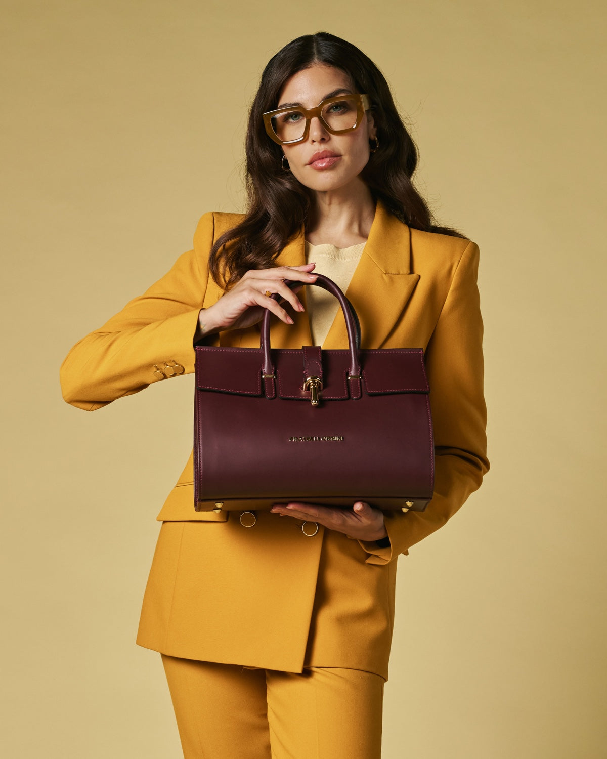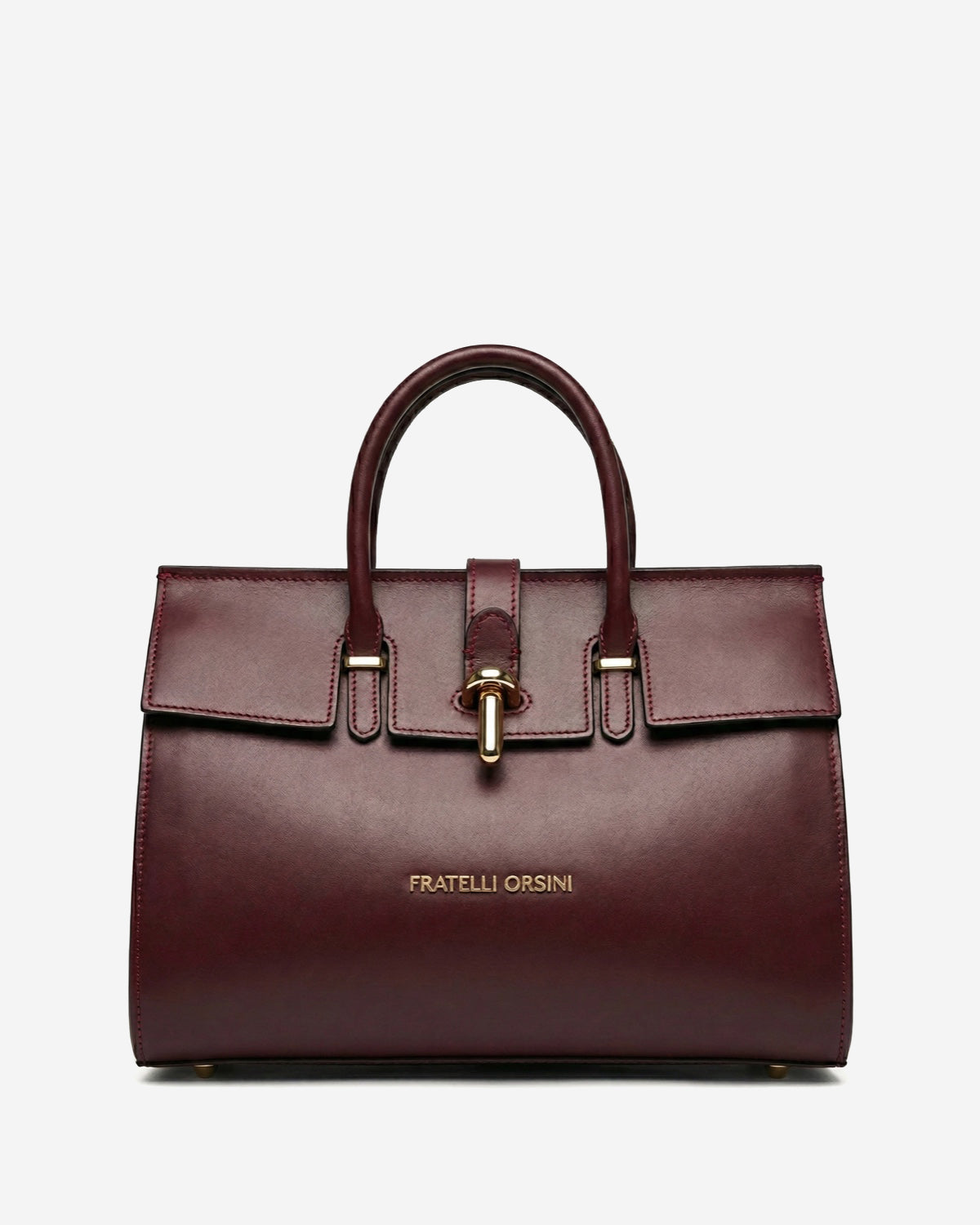 The Oriana handbag from Fratelli Orsini is defined by its structured elegance and refined top-handle silhouette. Handmade in Italy by skilled artisans, it is crafted from full-grain calf leather with a smooth finish that gives the design a polished look. The gold-toned clasp detail adds a subtle focal point while keeping the overall character understated and timeless.