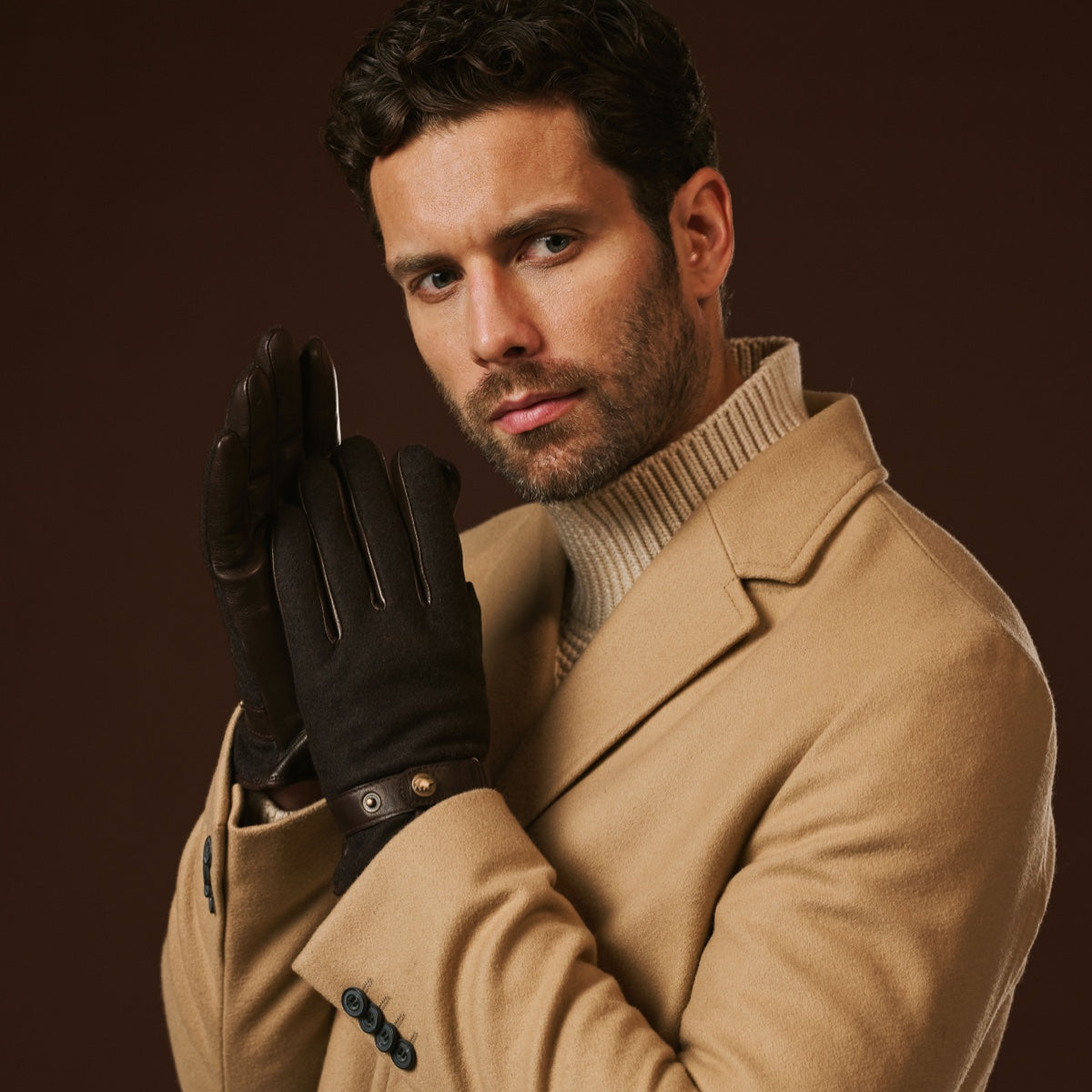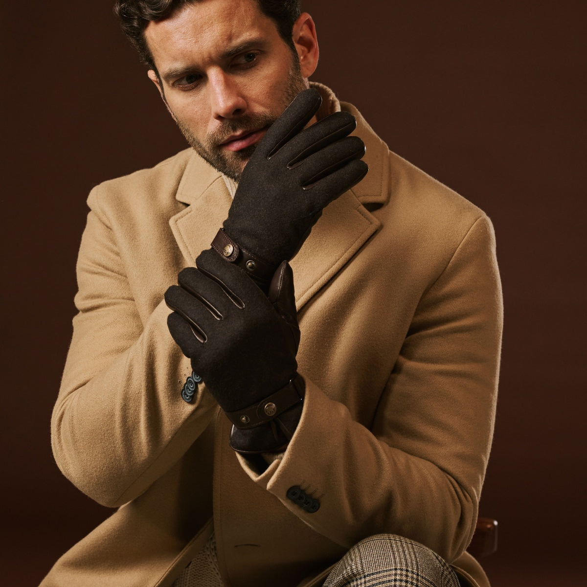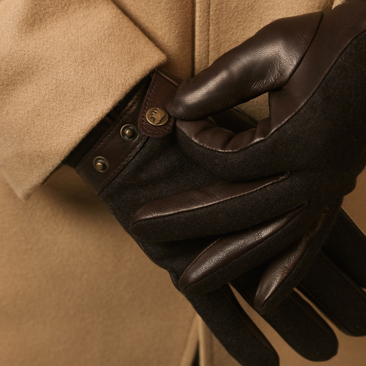 Fabrizio (dark brown) - Tweed men's gloves with touchscreen capability and adjustable snap button