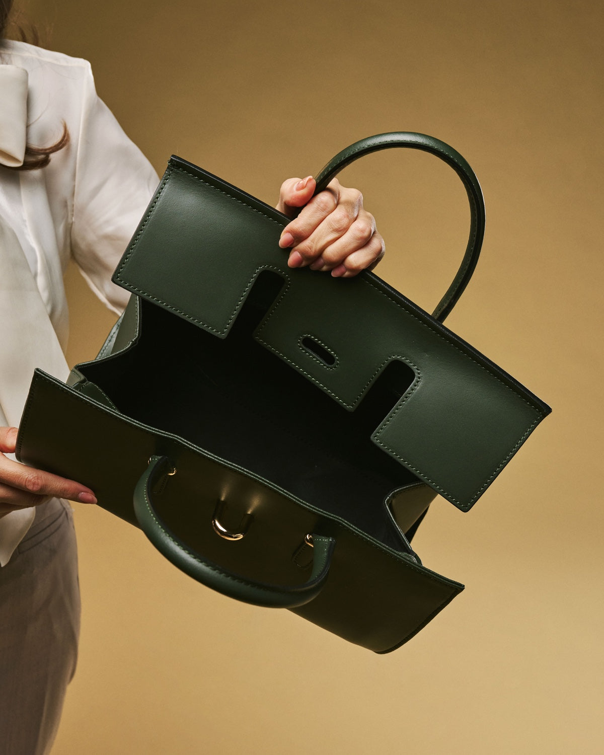 The Oriana handbag from Fratelli Orsini is defined by its structured elegance and refined top-handle silhouette. Handmade in Italy by skilled artisans, it is crafted from full-grain calf leather with a smooth finish that gives the design a polished look. The gold-toned clasp detail adds a subtle focal point while keeping the overall character understated and timeless.
