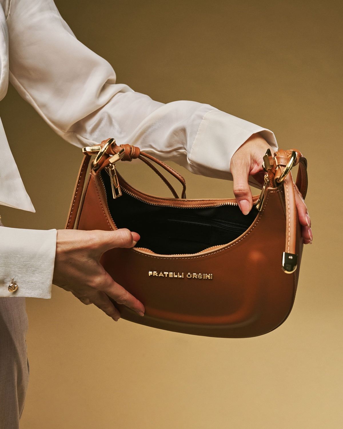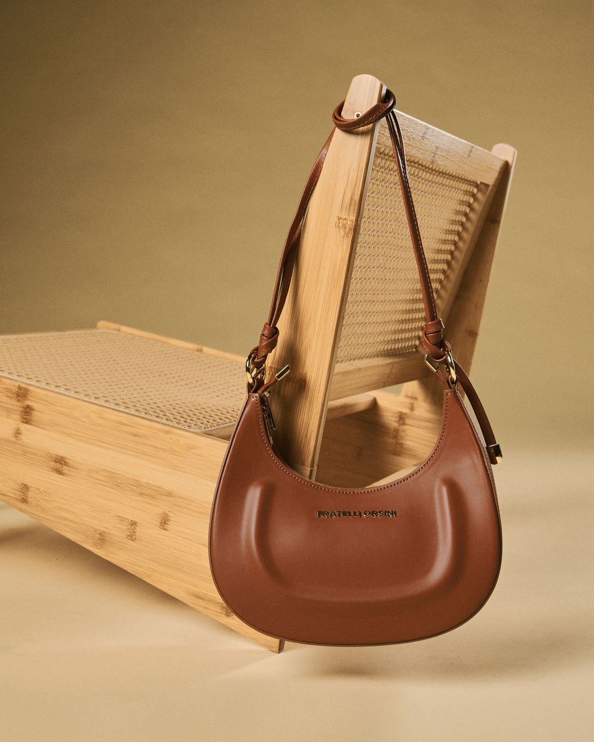 The Ornella crossbody bag from Fratelli Orsini is designed with a sculpted, crescent-shaped silhouette that feels contemporary yet timeless. Handmade in Italy by skilled artisans, it is crafted from full-grain calf leather with a naturally smooth finish that enhances its refined profile. The rounded structure rests comfortably against the body, giving the bag a graceful look that transitions with ease from day to evening.