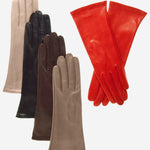 These long leather gloves for women are the perfect accessory for a special evening at a formal event or just a night on the town. There are no buttons or decorative details, just a silky smooth classic style of the absolute highest quality. The exceptional Italian glovemakers at Fratelli Orsini have included a beautiful white silk lining to complement the shell, which is a black, brown, red or white leather of fine Italian lambskin. The four-button length extends up the arm and comes to rest between the wrist and elbow.